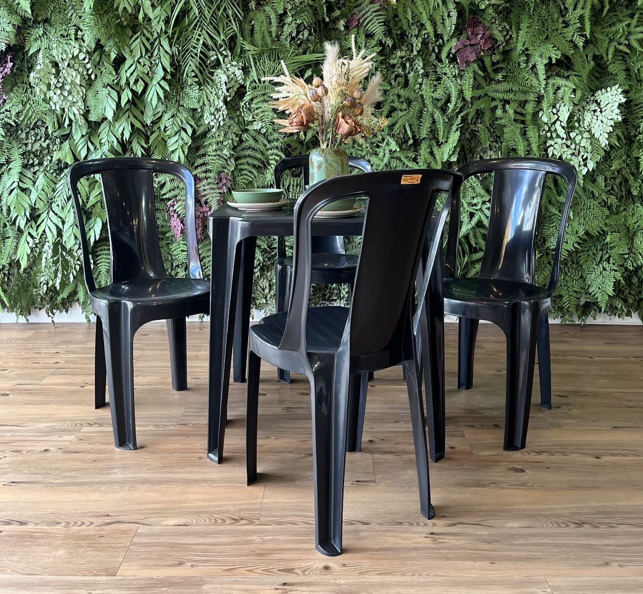 Funcionalidade, resistência e estilo para o seu dia a dia! O Jogo Cadeiras Bistrô, disponível no Vale das Cadeiras, é ideal para compor ambientes internos e externos com praticidade e elegância. Composto por 1 mesa e 4 cadeiras, esse conjunto é perfeito para áreas gourmet, varandas, cozinhas, bares e espaços comerciais.